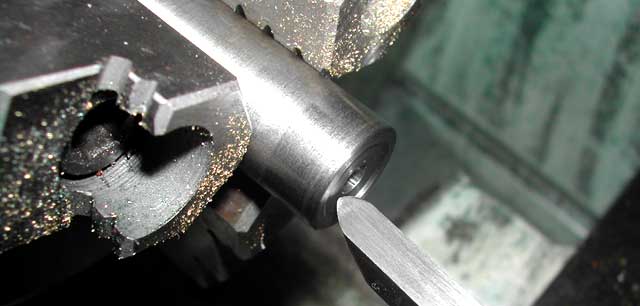 | This is the most commonly requested service. The barrel gets mounted in the lathe with a live center in the muzzle. The muzzle gets turned down to the required size and then threads are cut with a single point tool. This ensures that the threads will be perfectly concentric and parallel to the bore. After the threads are done and deburred, a new crown is cut to eliminate the damage caused by the live center. Other shops would consider this a 'precision' threading job. I can cut any commonly used thread specification. The threaded area will be left unfinished. Picture | |